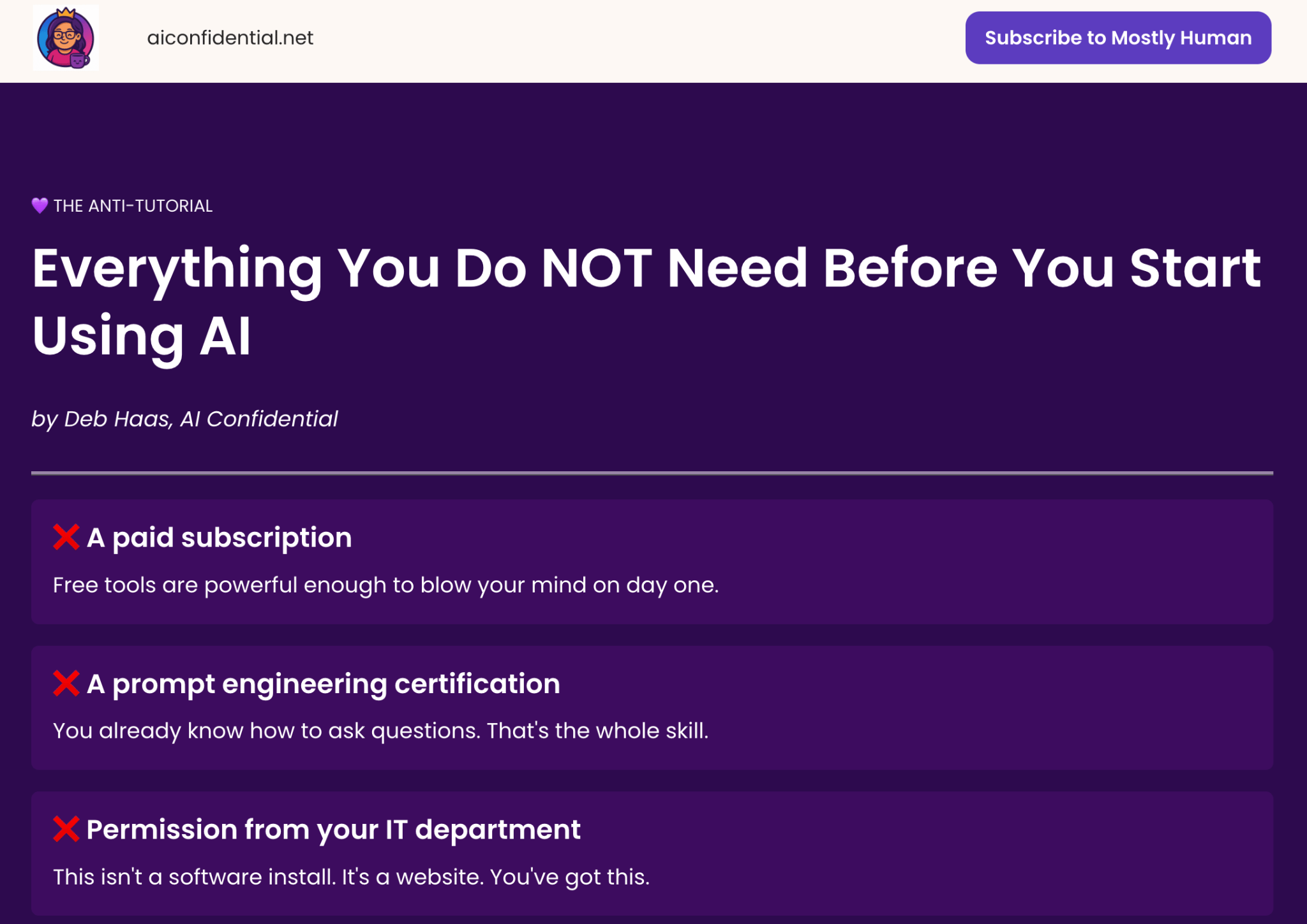 P.S. Forward this to the woman in your life who keeps saying she'll try AI "eventually." The Anti-Tutorial is literally made for her.